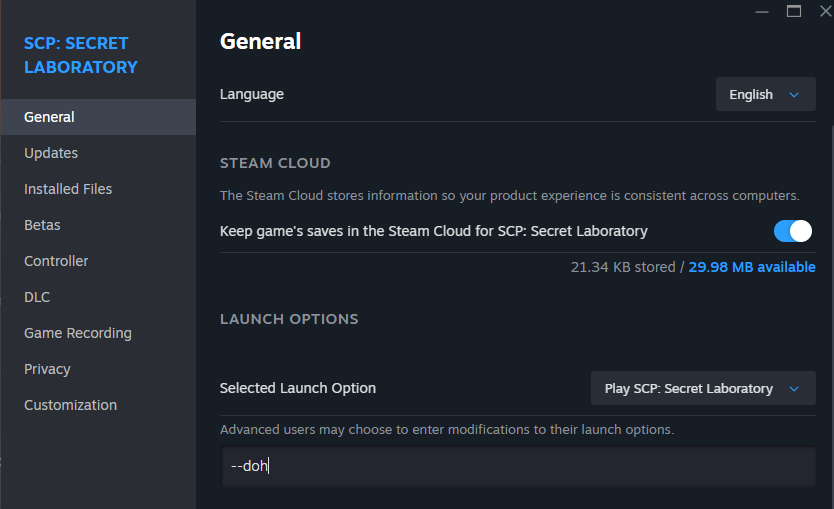 The second possible fix is using the --doh launch argument, which we can apply to the game using Steam.