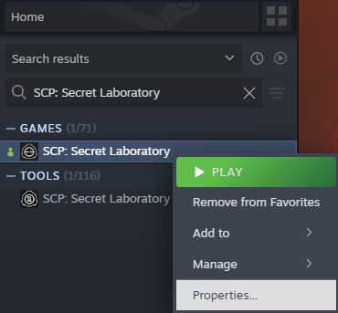 2. Left Click on SCP:SL in said sidebar, and click Properties.