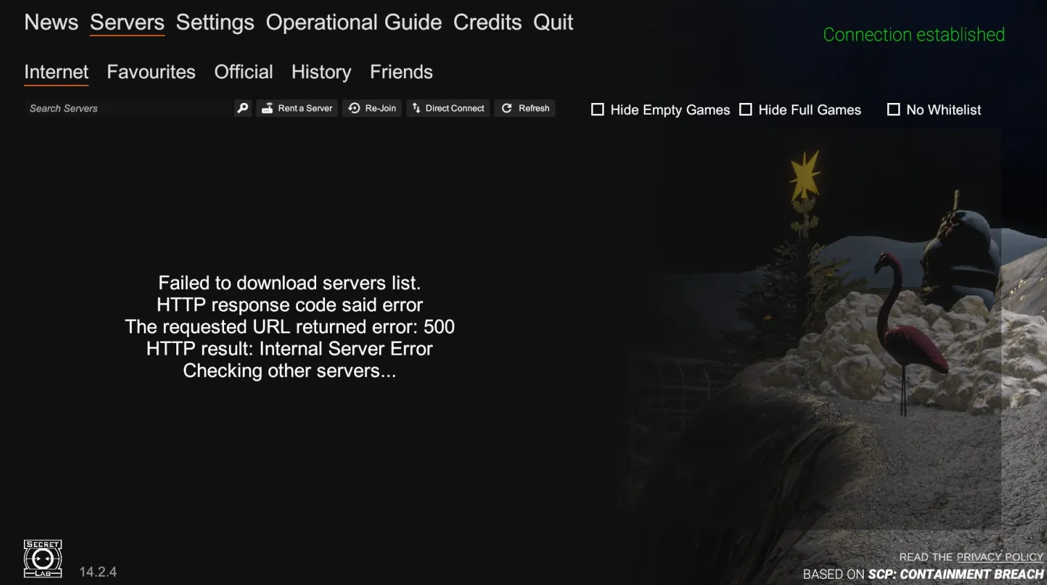 This solution involves using a VPN to play on SCP:SL game servers. Ideally you should not need to do this, however some issues might be out of our control (ISP, hardware, etc. failure) often require a VPN to get around.