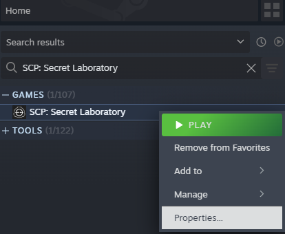 1. Go to your Steam Library and right-click SCP: Secret Laboratory > Properties.