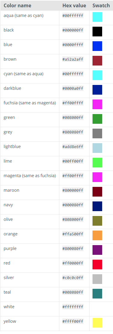 The list of colors is below, however, you can additionally use any hex code you want as well: